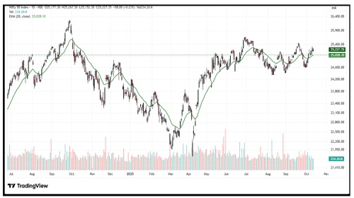 The index opened on a gap-down note following weak global cues. Despite the negative start, it held above the previous day’s low but remained rangebound throughout the session, showing no clear intraday direction. On the sectoral front, capital markets and financial services emerged as the top gainers, while defence and construction sectors were the major laggards of the day.