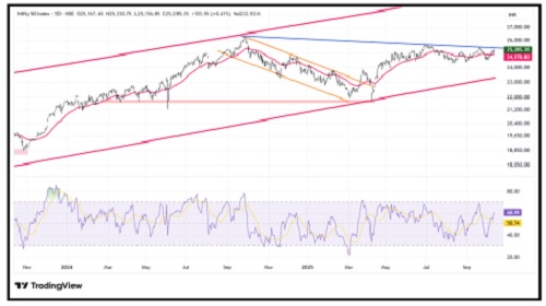The index opened on a muted note and traded within a narrow range of approximately 25,260–25,330, reflecting a phase of subdued intraday volatility. Despite the limited movement, the index managed to breach its three-day high, signaling emerging strength. It is currently trading firmly above its short-term moving averages — the 5-day and 12-day DEMA — which reinforces the underlying positive momentum. Technically, the index is now approaching the neckline of a sloping trendline (25450-25500). A decisive close above this level would confirm a trend reversal, shifting the sentiment from neutral to bullish and paving the way for further upside in the sessions ahead. On the sectoral front, PSU Banks and Realty stocks led the rally, showcasing relative strength, while Metal and IT sectors witnessed profit booking, contributing to a mixed market tone