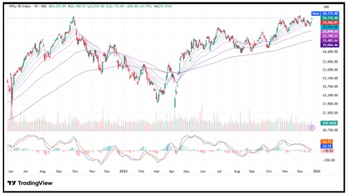 The index opened on a gap-up note but remained largely range-bound throughout the trading session. On the daily chart, the index has moved past the recent lower-top level near 26,057 and is comfortably sustaining above the 20- DEMA and 50-DEMA, indicating a positive near-term sentiment. On the sectoral front, Defense and Metal stocks emerged as the top gainers, while Consumer and Realty sectors were the top laggards for the day.