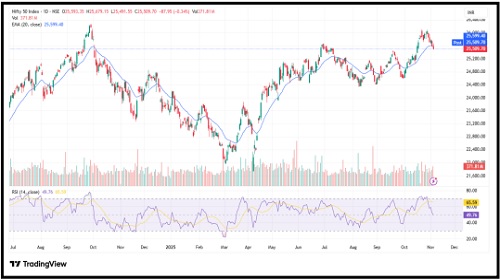 The index opened on a gap-up note and initially tested its support near the 25,350 level, making an intraday low of 25,318 around the 50-DEMA. Subsequently, a recovery emerged, lifting the index toward the previous day’s close. However, in the latter part of the session, the index showed signs of exhaustion after hitting an intraday high of 25,551. On the sectoral front, Capital Market and Metal indices emerged as the top gainers, while Infra and Consumer Durables underperformed during the session.