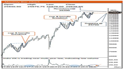 * Trend- consolidating within the 25,700-26,300 range for the past seven weeks, highlighting a phase of range-bound activity