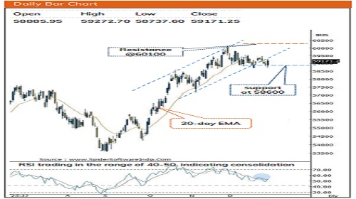 * Index closed above previous session’s high of 59,140 levels , Going ahead follow through buying could trigger a fresh upswing towards 59,500. A decisive breakout above 59,500 would strengthen bullish momentum and open the door for a gradual retest of the all-time high near 60,100.