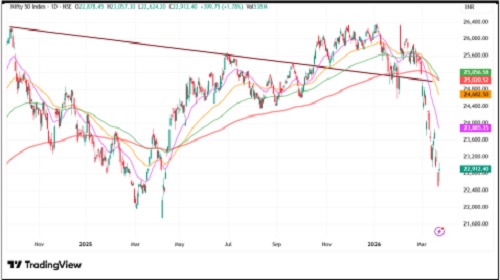 The index opened on a gap-up note and witnessed a mild retracement during the first half of the session. However, in the latter half, it staged a sharp recovery, moving back toward the 23,000 mark. On the daily scale, the index faced rejection near its 5-day moving average, leading to the formation of a Doji candlestick, indicating indecision at higher levels On the sectoral front, tourism and capital market stocks emerged as the top gainers, while there were no major laggards for the day.