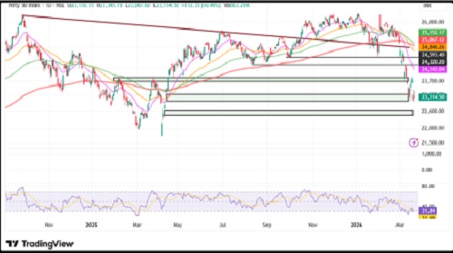 The Nifty has its crucial resistance 23400 (Pivot Level) and 23850 (Key Resistance). While support on the downside is placed at 23000 (Multiple Touches) and 22750 (Key Support).