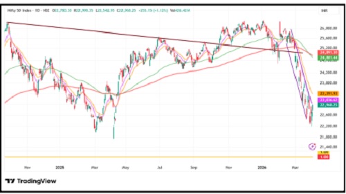 The index opened on a weak note and remained range-bound during the first half of the session. However, in the second half, it witnessed a sharp recovery, rallying toward the 22,998 level. Despite the intraday bounce, the broader trend on the daily scale continues to favor a “sell on rise” approach in the near term, indicating underlying weakness. On the sectoral front, consumer durables and PSU banks emerged as the top gainers, while media and oil & gas stocks underperformed during the session.