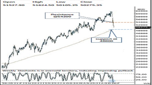* Index is set to open with a gap-up tracking positive global cues. Onset of geopolitical conflict, there have been multiple failed attempts of pullback. Hence, tracking early signs of de-escalation of geopolitical conflict, initially we can expect a relief rally towards 54200. However, for a meaningful pullback to materialize Index needs to close above short-term moving average (54200) coinciding with recent swing high. Meanwhile, strong support is placed at 48800(being the 200-day EMA).