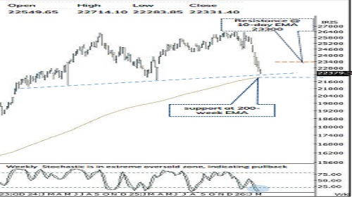 * The index opened the week on a negative note and slipped below its previous week low (22471). As a result, daily price action has resulted in bear candle with upper shadow in daily time frame, indicating selling pressure at higher levels.