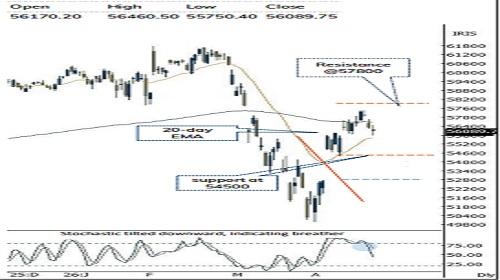 * Key point to highlight is that Index has been consolidating in vicinity of 200-day EMA. Going ahead We expect Index to hold above 54500 being 38.2% retracement of current upmove (54356-57456) and gradually resolve higher and head towards 57800 in the coming weeks being previous support will now act as resistance (change of polarity principle)