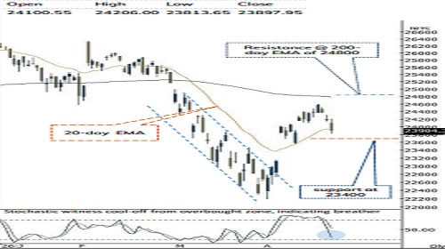 * This consolidation would make market healthy, as it strengthens the market’s foundation for an eventual push toward the 24,800 mark (aligned with the 200-day EMA) in the coming weeks. Thereby, any decline from hereon should not be construed as negative instead capitalize it to accumulate high-quality stocks on dips backed by strong earnings as strong support is placed at 23100, being 61.8% retracement of current up move (22182-24601) coincided with the gap aera (23555-23154).