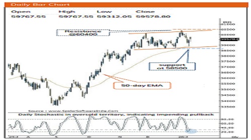* Key point to highlight is that, Index continues to trade within rising channel and managed to close above its previous session high after series of lower high-low in past six-session, indicating positive bias. Going ahead, we believe index to witness follow through strength and accelerate its move towards 60400 as strong support is placed at 58500, being its previous swing-low and 50-day EMA