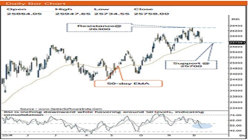 * Index is likely to open on a positive note tracking positive global cues amid Fed policy outcome. The index has been broadly consolidating in 26300-25700 zone over past four weeks. A decisive breakout on either side of the range would dictate the further course of action. We expect volatility to remain elevated in the upcoming sessions tracking US Fed rate outcome coupled with development on USIndia Trade deal. Thereby, holding 25700 levels on a closing basis would keep pullback options open. Going forward, Follow through strength and a decisive close above psychological mark of 26000 could confirm pause in downward momentum and open the door for a retest upper band of consolidation of 26,300 in the coming weeks. Meanwhile, 25,700 would continue to act as immediate support being 61.8% retracement of Nov-Dec rally (25318-26325) coincided with 50 days EMA