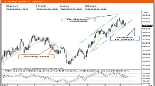 * In today’s session, Index is likely to witness positive opening tracking firm global cues. The index has been largely oscillating in a 60000-58600 range while sustaining around its 20-day EMA. The absence of decisive close above previous session high has resulted into prolonged consolidation. Hence, for a meaningful pullback to materialize, index need to decisively close above previous session high of 59440 which would open the door for pullback towards 60000. Failure to do so would result into extension of time wise consolidation which would make market healthy and pave the way to challenge All Time High in coming weeks.