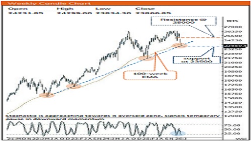 * Index is likely to open with a gap-down amid ongoing geopolitical tension that has led to sharp surge in Brent crude prices. A key point to note is that the index failed to witness follow-through strength after the past two sessions of recovery and slipped below the previous session’s low, indicating a resumption of the corrective phase. Going ahead, the formation of lower high-low clearly signifies corrective bias leading to extended correction wherein strong support is placed at 23500-23200 zone. Meanwhile, to pause the ongoing corrective move, a decisive close above the bearish gap aera of 24300-24,400 would be a pre-requisite. The key support of 23,200-23,500 zone based on following observations: