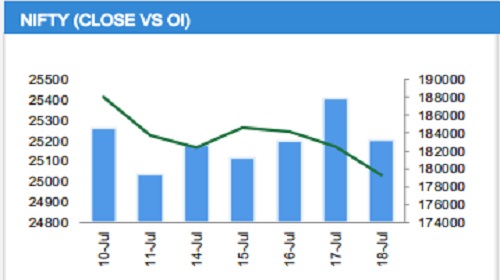 Nifty 50 closed the week at 24,968, falling below the key support level of 25,000. Market sentiment remains neutral to negative, as shown by an advance-decline ratio of 0.42, indicating strong selling pressure. The India VIX settled at 11.39, signaling low volatility. For the 24 July expiry, significant Call OI build-up is seen at 25,200 and 25,100, highlighting a resistance zone, while on the downside, the highest Put OI stood at 24,900 followed by 24,500, suggesting an immediate support zone. The Put-Call Ratio stands at 0.60, indicating more call trading activity than put options.
