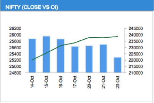 The Nifty 50 closed at 25,891, witnessing profit booking during the second half of the session after a gap-up opening. The index faced selling pressure near the 26,100 level, dragging it back towards 25,900, indicating a near-term hurdle on the daily chart. On the derivatives front, Nifty’s monthly expiry data reflected fresh Call OI buildup at the 26100 and 26200, zone that coincide with the all-time high levels, suggesting strong resistance. On the downside, major Put OI at the 25,800 strike indicates that sustaining above this level could again trigger a uptrend journey.