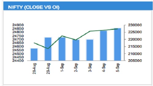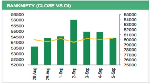 The Nifty 50 ended the week at 24,741, registering gains of over 300 points. Significant Call OI concentration at the 24,800 and 25,000 strikes indicates immediate and strong resistance zones for the upcoming weekly expiry. On the downside, the index witnessed a reversal from 24,400, along with significant Put OI build-up at the 24,500 strike, which highlights the zone as a near-term support. Overall, the index is likely to remain within a broader range of 24,500 –25,000.
