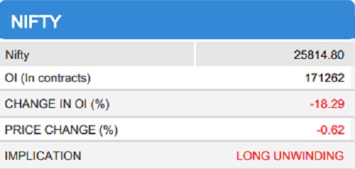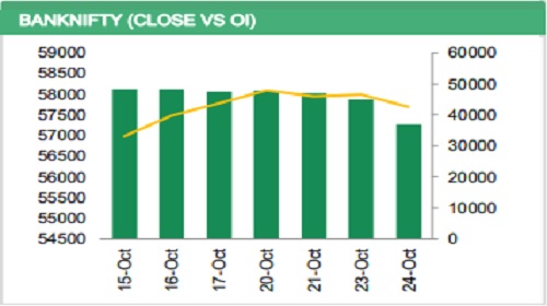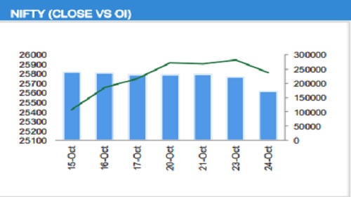The Nifty 50 ended the week at 25,795, witnessing profit booking from the 26,100 level and closing with marginal gains. On the weekly chart, kind of gravestone doji candlestick pattern indicates waning bullish momentum and hints at a potential corrective move towards the 25,600–25,650 zone. However holding above this level maintains the bullish sentiment, paving the way to reclaim higher levels in the near term. Derivatives data show, Call OI buildup at 26,000 strikes indicates immediate resistance levels, while Put OI buildup at the 25,600 and 25,500 suggests an immediate support for index.