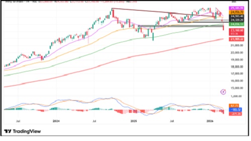 The Nifty 50 opened on a gap-down note and extended its bearish momentum toward the day’s low of 23,112. On the daily chart, the price structure continues to weaken, with the index forming lower tops and lower bottoms, while the gap-down opening reflects a cautious undertone in the market. On the sectoral front, most major indices ended in the red, with Metal and Defence emerging as the top underperformers for the day.