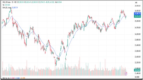 The index opened on a positive note and witnessed upward momentum during the first half of the session, making a day high of 25,653 near the 12-DEMA level. However, it later slipped into a gradual decline, paring most of its early gains. On the daily scale, the index formed a bullish candlestick with a long upper wick, indicating a neutral sentiment. On the sectoral front, IT and Defence were the top outperformers, while Media and Realty sectors lagged behind during the session.