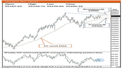 Equity benchmarks wrapped up the volatile week on a positive trajectory, aided by encouraging quarterly business update. The Nifty gained ~1.6% to settle the week at 25285. Sectorally, FMCG, Metal and Auto were the laggards. Whereas, IT, Realty and Pharma outshone.