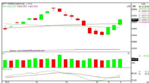 Action: Nifty has an immediate Resistance at 25150 and on a decisive close above expect a rise to 25230-25300 levels.
