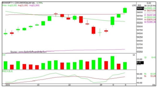 Bank Nifty’s next immediate resistance is around 56480 levels on the upside and on a decisive close above expect a rise to 56650-56900. There is an immediate support at 56000-55740 levels.