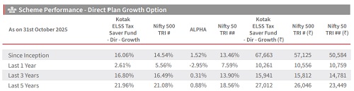The inception of Kotak ELSS Tax Saver Fund dates back to 23rd November 2005. Rs 10,000 lumpsum investment in the fund during the time of inception would have turned to Rs 68,753 with a compounded average growth rate (CAGR) by over 16.13%. The fund has beaten benchmark NIFTY 500 TRI returns of 14.58%.