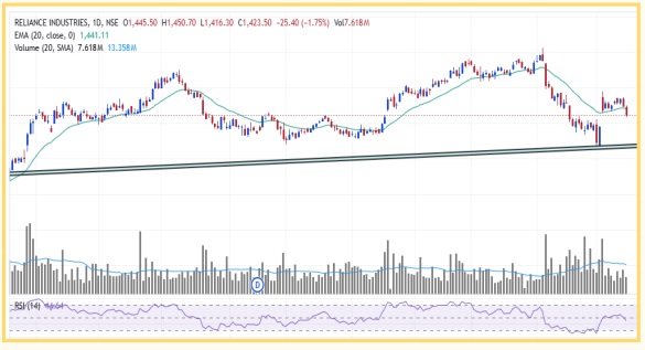 * On the daily chart RELIANCE has decisively slipped below its short term moving average of 20-DEMA, which has previously acted as the immediate support, so that the short-term trend has shifted from bullish to bearish.