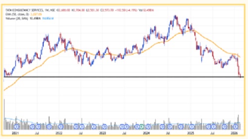 * On the daily chart TCS has decisively breached a major multi-year support level of 2600, signalling a breakdown from a long-term distribution phase.
