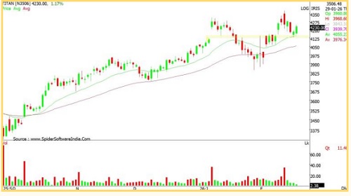 * On the daily chart TITAN has maintaining a strong uptrend with consistently trading above its key moving averages. The recent price action shows a successful retest of 20-DEMA zone, confirm the near term bullish momentum.