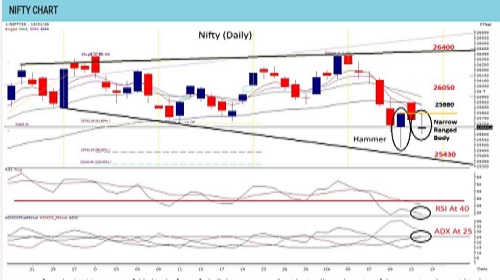 Recovery from the 25430 support unfolded in the form of a bullish Hammer candlestick, signalling exhaustion of the corrective phase within the oscillating band of 25880–25430. This was followed by another reversal formation resembling an Inverse Hammer in the subsequent session. However, both patterns will gain validity only if the index decisively breaches and sustains above 25880 on a closing basis. Options data reflects a range shift towards 25500–26000, with a mild bias pointing to strong support near 25500 for the current weekly series. With the truncated trading week nearing its end, the index may witness a sharp swing on either side beyond the 25880–25500 band. A decisive close above 25880 would indicate a revival in trend strength and could open the door for a move beyond the 26130 zone. Traders may consider initiating fresh long positions only on a strong weekly closing-based breakout above 25880. Until then, a long–short trading approach is advisable, as the index is likely to remain range-bound between 26050 and 25430.