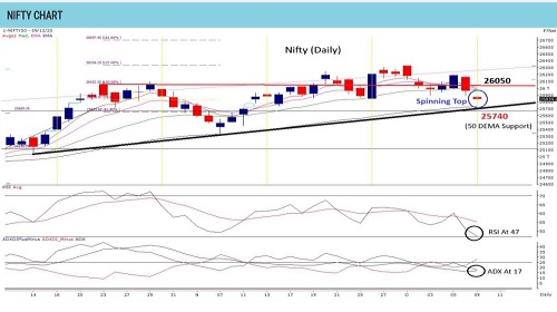 Monday’s decline was sharp and triggered unwinding of long positions, with a continuation of that weakness seen in yesterday’s session as well. Price action remained soft in the first half, though the weekly expiry event induced a meaningful pullback later in the day. The index eventually rebounded from its 50-DEMA support at 25740 and closed near 25840, forming a ‘Spinning Top’ candle. Trend indicators also echoed the weakening structure—RSI slipped below the neutral 50 mark, and ADX eased to 16, signalling a drop in directional strength. The index continues to hold a strong base near 25900, but this zone is being retested. A follow-through close below 25900 could further dent sentiment and open the gates for a slide towards 25700, and potentially even 25440. On the upside, only a sustained move above 26050 would revive bullish momentum and realign the index toward 26330–26500. Options data suggests firm boundaries at 26000 (resistance) and 25800 (support), with positioning concentrated near 25950. The PCR OI at 1.02 indicates the market is not yet in oversold territory, leaving room for additional downside if selling resumes. Traders should remain cautious and adopt a long–short combination approach until the index stabilizes above 26050. Fresh averaging is best avoided until clear directional strength re-emerges above this threshold.