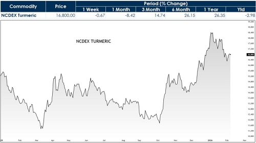 This shift triggered a strong rally from October onwards, with prices climbing from lows near Rs.11,600 to a peak of around Rs.19,050 in January. Currently, turmeric futures are trading near Rs.16,700, reflecting some profit-booking and the anticipation of fresh arrivals. While higher acreage remains a structural overhang, availability of the new crop from February is expected to exert near-term pressure.