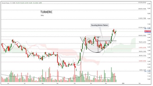 Looking at the Daily chart of Turmeric Futures on NCDEX, the market is showing a clear recovery after a prolonged consolidation phase. Prices are trading above 16200, forming a well-defined rounding bottom pattern, which usually signals a gradual shift from selling pressure to buying interest. Momentum indicators are supportive, though volatility remains slightly elevated, suggesting active participation from traders.