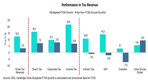 * Gross tax collections have been subdued in the fiscal year so far, up by just 3.3% (y-o-y) in 8M FY26, much lower than the budgeted growth of 12.5%.