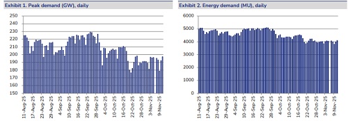 Power demand remained muted in Oct’25, with energy/ peak demand declining by 6%/ 4% YoY. Overall generation fell 8% YoY driven by a 14% YoY drop in thermal generation, while hydro and renewable generation rose 14% and 10% YoY. During the month, 2.3GW of RE tenders were issued and 3.6GW of RE capacity was allocated. Solar and wind capacity additions stood at 24.2GW and 3.6GW in YTDFY26 vs. 10.3GW and 1.8GW in YTDFY25. Muted demand, coupled with higher hydro and renewable generation, led to a decline in thermal PLF to 58% in Oct’25 vs. 67% in Oct’24. Coal production and offtake declined 8% and 5% YoY. Merchant tariffs improved to INR 4.4/unit from INR 3.9/unit in Oct’24. Solar PV module prices have remained flat since Jan’25, while polysilicon prices have begun to rebound after bottoming out at USD 5.6/kg in Jun’25 and silver prices have hit a fresh high of USD 50/troy ounce. In this report, we present 52 charts and exhibits to help track the ongoing energy transition