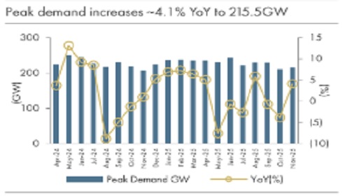 peak demand revived, up 4%YoY to 215.5GW in November. Peak demand increased 2.4%