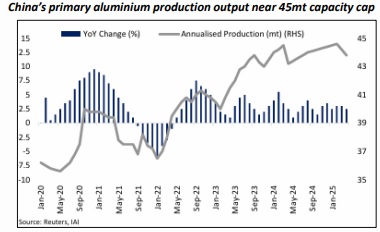* China’s annual aluminum output cap of 45 million tons is expected to be breached later this year