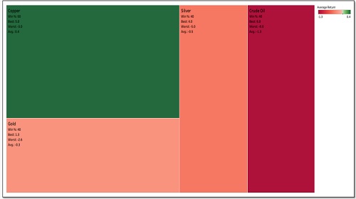 Weekly Seasonality: Shows how each major commodity has fared in the upcoming week based on its historical performance