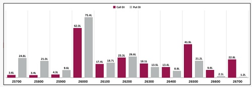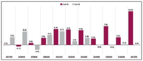 * Coming to puts, the 26,100 (5.7 Lc), 26,000 (4.1 Lc), and 25,800 strikes (5.6 Lc) saw considerable addition in open interest. There was notable Unwinding witnessed at 25,900 & 25,600 strike.