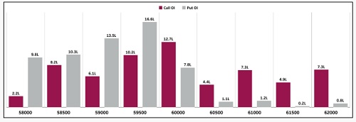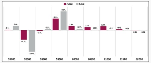* For the Bank Nifty based on the current monthly expiration cycle - notable addition in calls was seen at the following strikes - 59,500 (5.4 Lc), 60,000 (1.9 Lc), and 60,500 (1.3 Lc), respectively. There was significant unwinding observed at 58,500 strike.