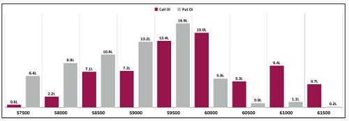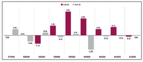 * Coming to puts, the 59,400 (0.5 Lc), 58,800 (0.6 Lc), and 57,800 strikes (0.6 Lc) saw considerable addition in open interest. There was significant unwinding observed at 60,000 & 59,800 strike.