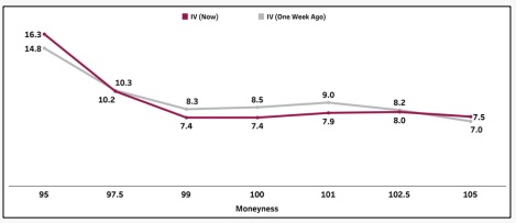 * The decrease in implied volatility for both out-of-the-money call and put options compared with the previous week suggests that market participants are expecting stable price behavior and assign a lower likelihood to sharp, abrupt moves.
