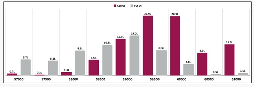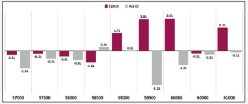 * Coming to puts, the 59,100 (1.5 Lc), 58,900 (2.8 Lc), and 58,700 strikes (1.3 Lc) saw considerable addition in open interest. There was significant unwinding observed at 59,500 & 60,000 strike.