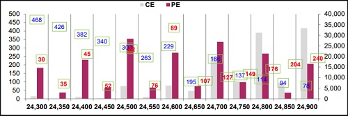 * The highest Open Interest on the Call side is at the 24,900 strike, followed by 24,800 which could act as resistance levels.