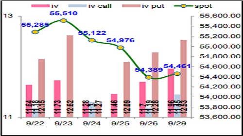 * The premium for the At-the-Money option stands at Rs. 1444, indicating a probable weekly trading range between 53,300 and 55,800