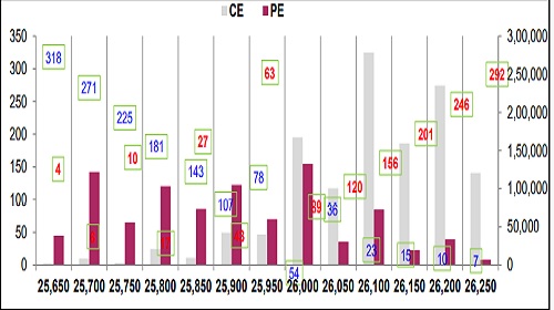 Maximum Put OI is at 26,000, followed by 25,900, indicating strong support in this zone.