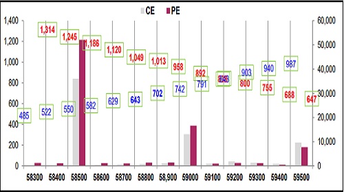 * The highest Open Interest on the Call side is observed at the 58,500 strike, followed by 59,000 which may act as resistance levels.
