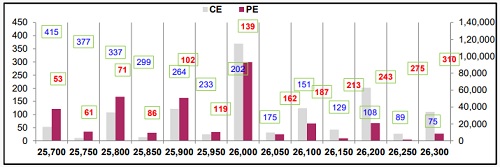 * The highest Open Interest on the Call side is at the 26,000 strike, followed by 26,200 which could act as resistance levels.