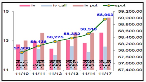 * The premium for the At-the-Money option stands at Rs. 838, indicating a probable weekly trading range between 58,000 and 60,000.